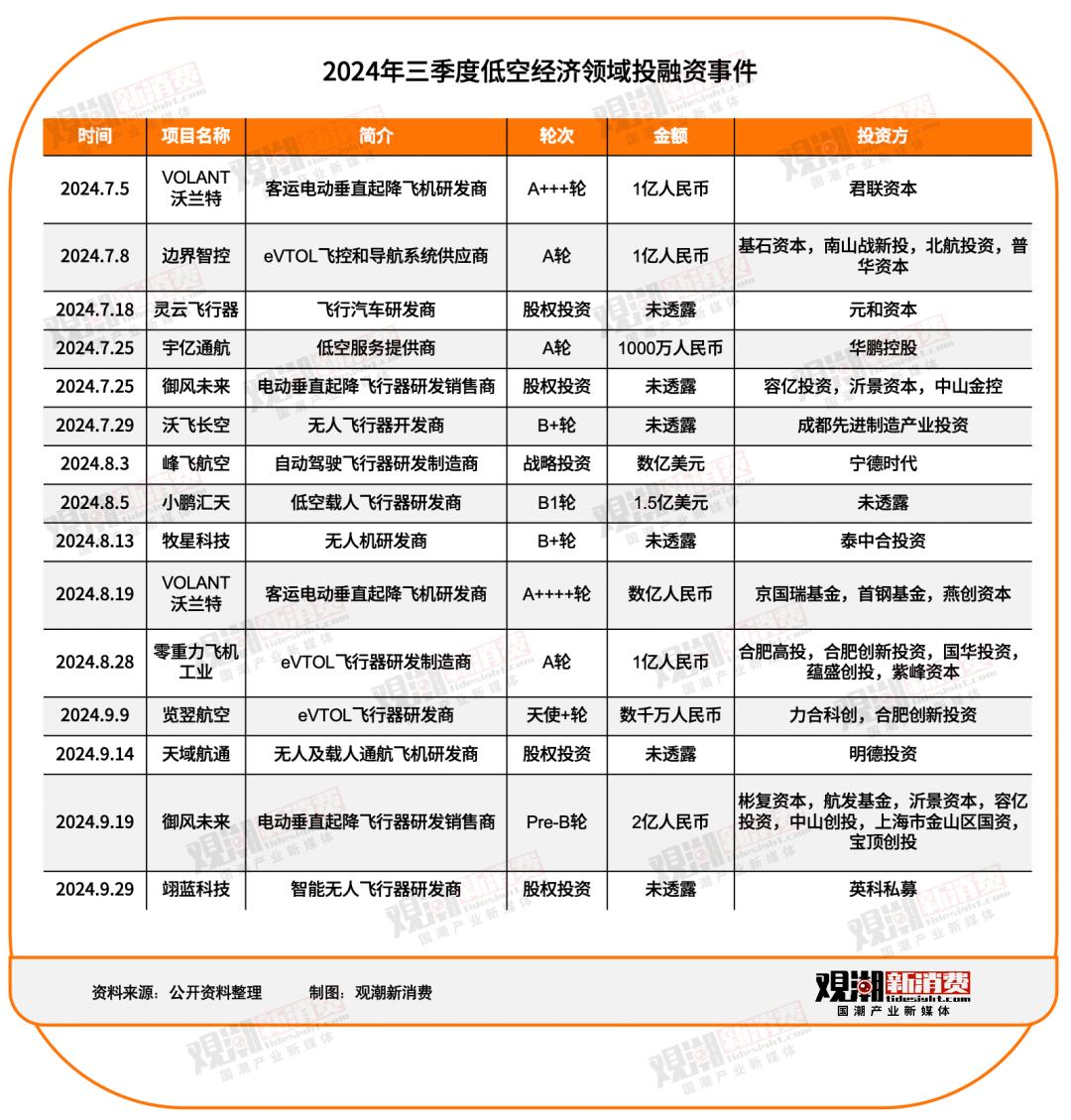 低空经济自2021年被首次写入国家规划以来一直是科技领域的投资热点,今年国家政策以及各地方政策的密集出台更是将该赛道的发展推向了新的高潮。2024年三季度,低空经济赛道共产生14起投融资事件,披露的总融资金额超28亿元,沃兰特、御风未来等企业更是获得多轮融资。