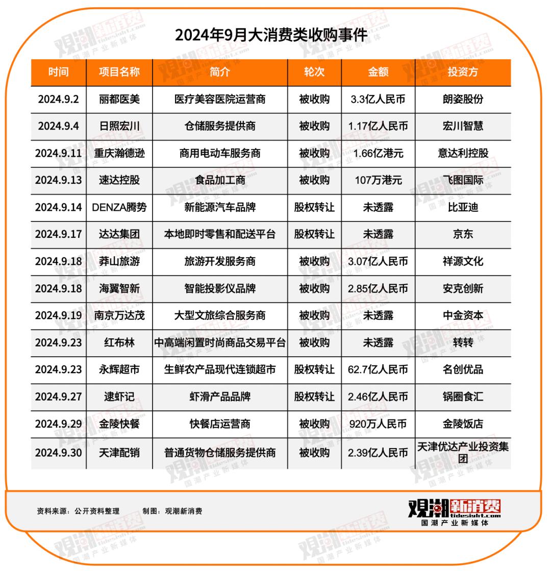 2024年9月,大消费市场共发生14起收购事件, 比亚迪、京东、安克创新等企业均有收购动作,金额最高超60亿元。
