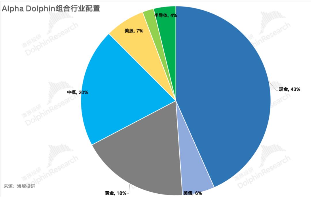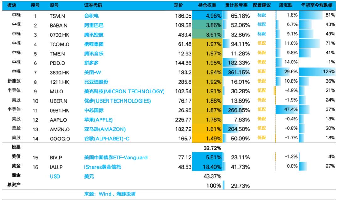 Alpha Dolphin虚拟组合共计持仓14只个股与权益型ETF,其中标配3只,8只权益资产为低配。其余分布在了黄金、美债和美元现金上。截至上周末,Alpha Dolphin 资产配置分配和权益资产持仓权重如下: