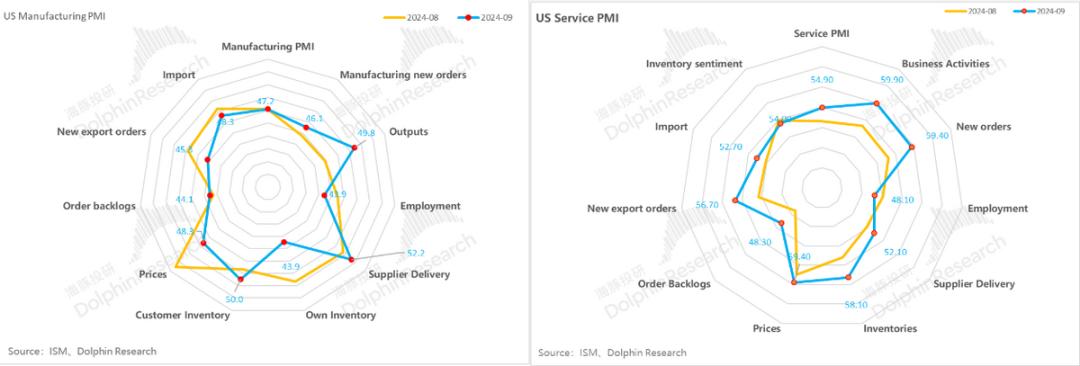 如果说非农也就来回调的幅度太大,可信度变低的话,作为前瞻经济指标的制造业和服务业PMI新订单双双走高,隐含的同样是经济走势相对平稳、未来更偏向软着陆的信号。