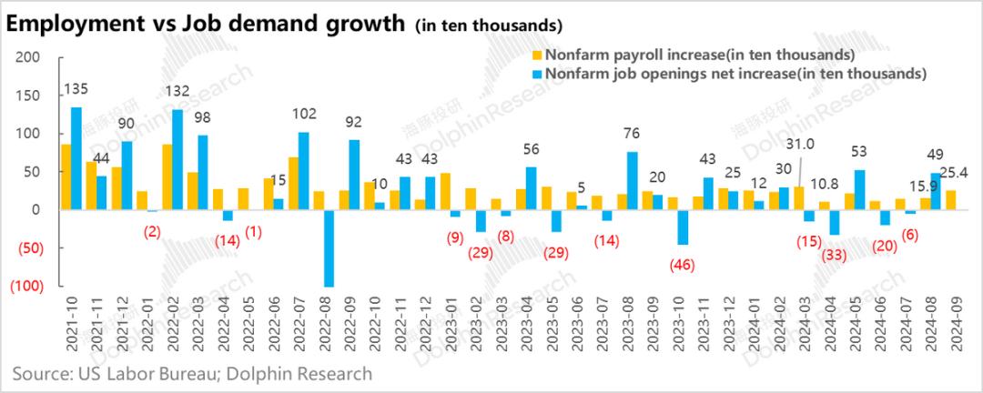 比如说,按照8月JOLTS所公布的804万的非农岗位空缺数,期间15.9万的新增非农就业数,相当于8月企业净增了49万的岗位需求,完全逆转了之前两个月企业净裁员的情况。或者说,前两个月的净裁员可能更多是与极端天气下,企业的临时性离岗有关,没有趋势性裁员。