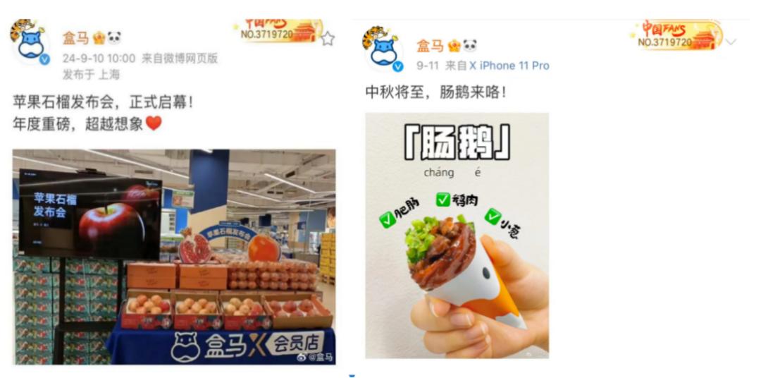 9月10日,苹果发布iPhone 16之际,盒马紧跟着在门店开了一场“苹果石榴”发布会。次日,盒马“肠鹅来咯”又承接起中秋热度。“谐音梗”加“蹭热度”式的营销,成功让八竿子打不着的盒马在流量池博得一点热度。