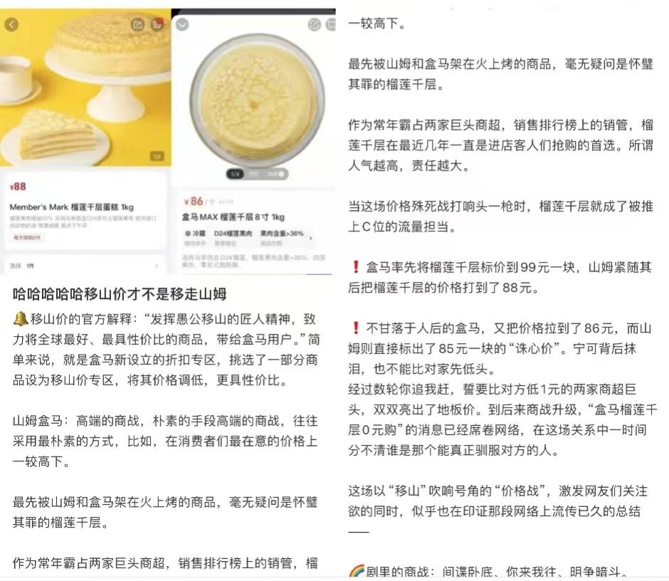 相较于山姆,盒马会在产品力上略显逊色。尽管借助“移山价”营销“碰瓷”山姆产品,在榴莲千层的价格战中标榜更高榴莲含量与更低价格,但这种单点突破的方式,难以全面彰显品牌整体的产品竞争力与优势。