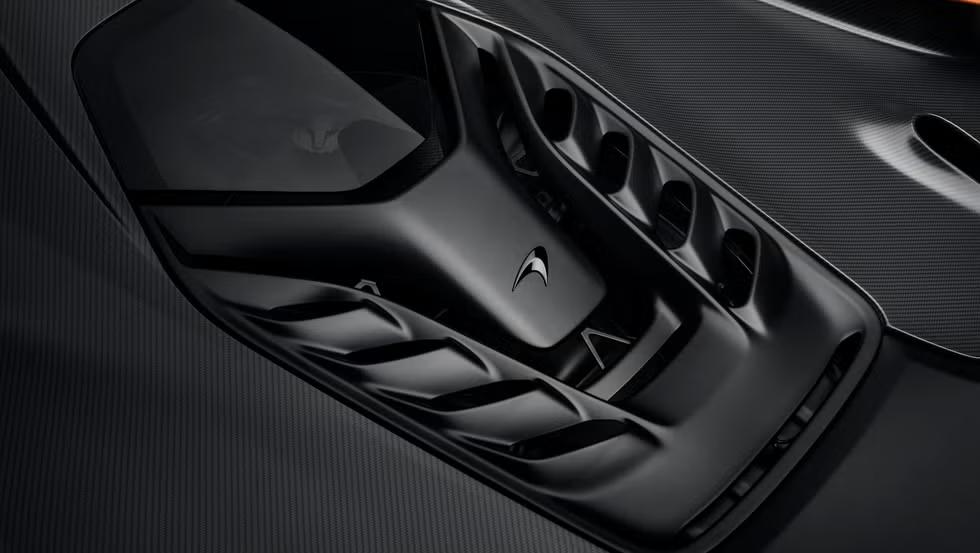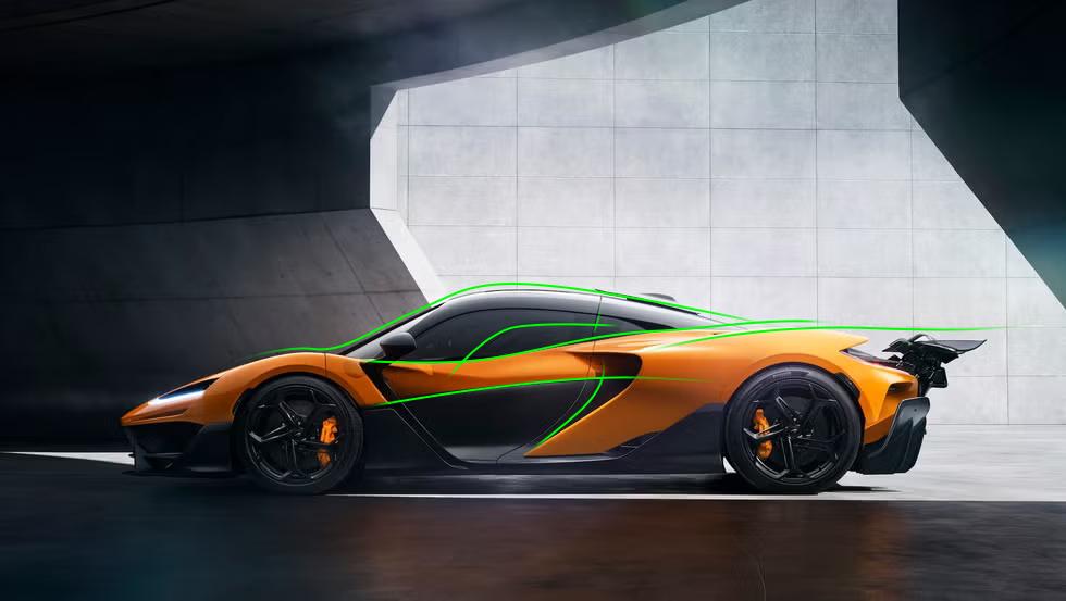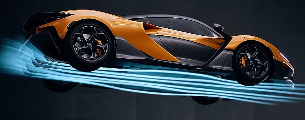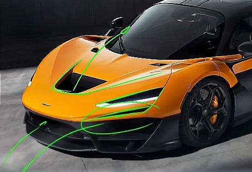 另一条朝下的线条则是把空气绕过挡风玻璃后的形状给描绘出来,黑色的部分则是气流绕过车轮后的形状,两股气流最终汇聚在车门后侧以迈凯伦 logo 为灵感设计的大风道里。