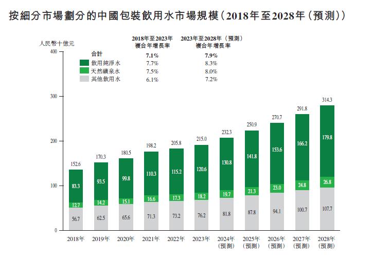 根据灼识咨询数据显示,2018-2023年中国包装饮用水市场规模综合年增长率为7.1%,预测2023年-2025年增速将达到7.9%,整体的市场规模将从2150亿,增长到3000多亿。