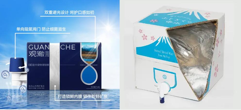 该类型包装已成功商用。就在今年3月,宏宝莱推出一款名为观澈BIB锁鲜矿泉水,水源来自长白山,每箱9.68L,产品亮点为人性化包装,新鲜矿泉。Foodaily还在日本市场发现,有一款名为“ふじざくら命水”11.5L的袋装富士山天然水,也采用BIB包装。