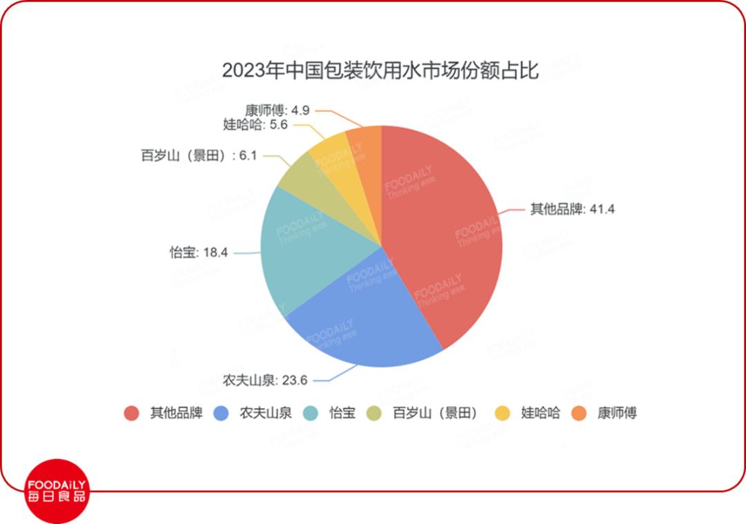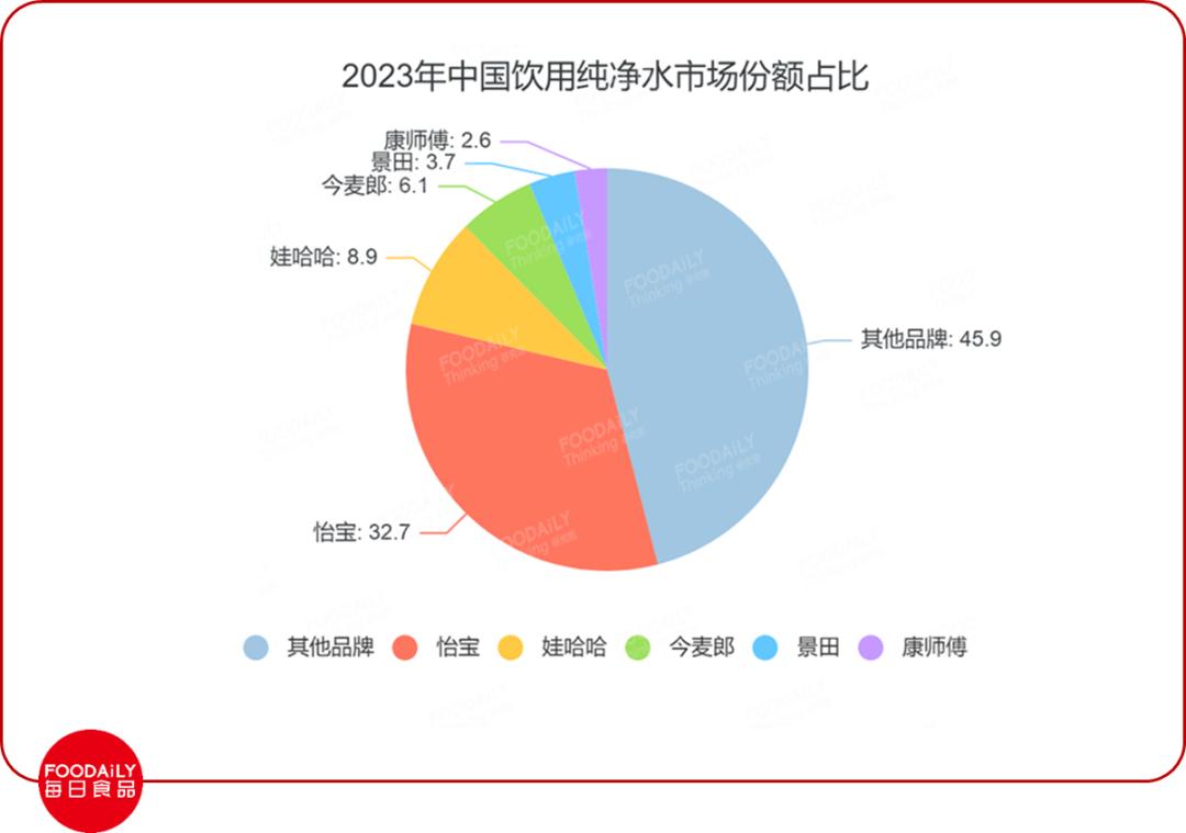 灼识咨询数据指出,纯净水的市场份额占整个瓶装水份额的半数以上,达到千亿规模,前五大头部品牌依次是怡宝、娃哈哈、今麦郎、景田、康师傅。