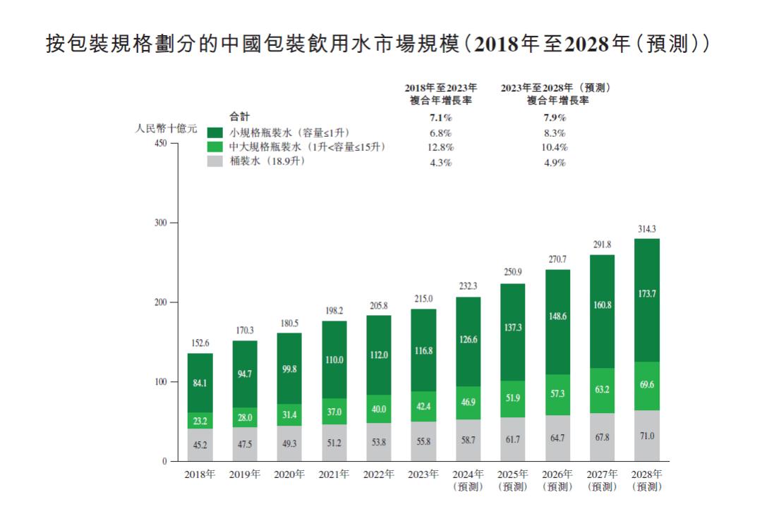 根据灼识咨询数据,未来中大规格瓶装水将超越其他规格包装水的增长速度,并将在2023-2028年保持10.4%的复合年增长率。