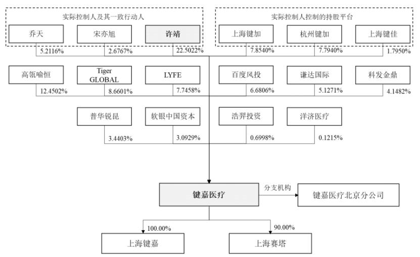 招股书显示,键嘉医疗的实际控制人许靖直接持有公司22.50%的股份,并通过其控制的员工持股平台上海键加、上海键佳、杭州键加,及其一致行动人乔天、宋亦旭,合计控制公司47.83%股份。