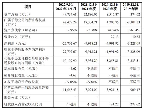 键嘉医疗2019年、2020年营收分别为10.68万、29万,2021年和2022年1-9月没有营收;2019年、2020年、2021年、2022年1-9月(简称“报告期”)净利润分别为-3228万元、-4992万元、-9918万元、-2.77亿元,报告期内合计亏损约4.58亿。