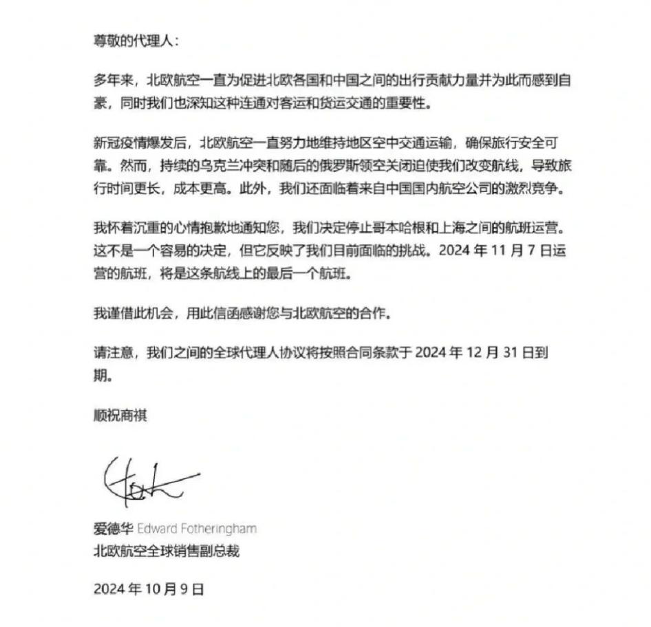 随后,北欧航空全球销售副总裁爱德华致信全球代理人,确认了停航一事,理由无外乎是老生常谈的俄乌冲突导致俄罗斯领空关闭,迫使公司改变航线,导致旅行时间更长、成本更高,以及面临着来自中国国内航空公司的激烈竞争云云。