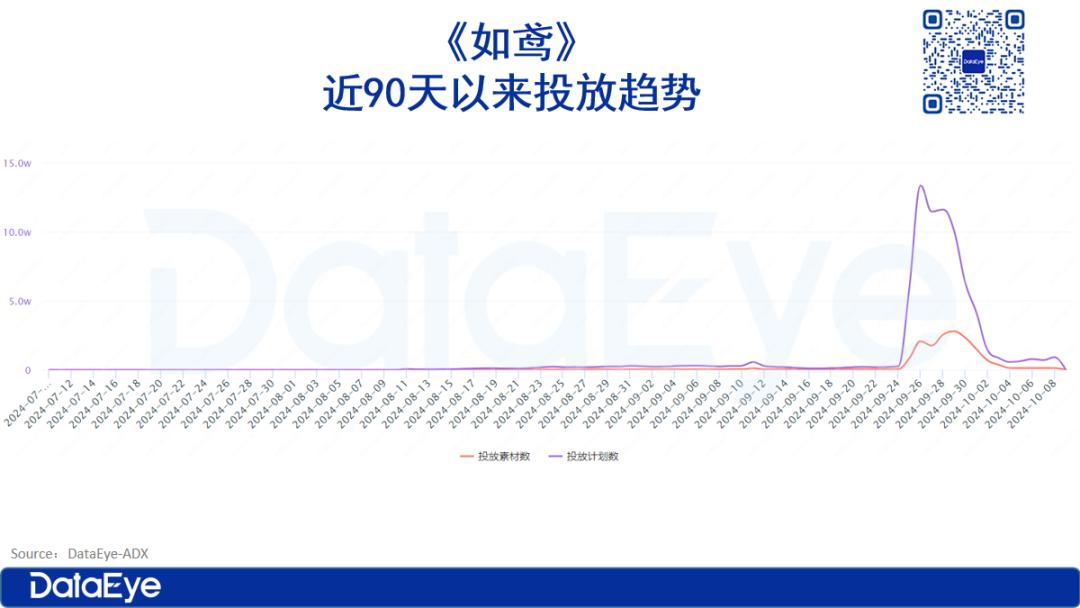 DataEye-ADX数据显示,《如鸢》在八月中旬开始投放,日均投放在500组(视频+图片)素材左右,上线前一天,继续加大投放力度,每日成倍递增,上线当天大规模投放,投放素材超过2万组(视频+图片)素材。在9月29日达到顶峰,投放约2.7万组(视频+图片)素材。