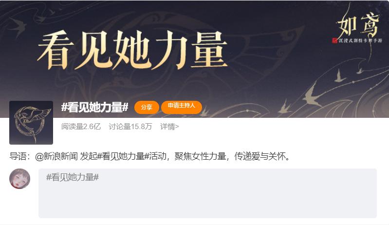 8月23日,《如鸢》联合新浪新闻发起#看见她力量活动,分享印象深刻的女性故事、女性人物记录、女性文化历史。该话题目前已经获得2.6亿阅读,15.6万讨论量。