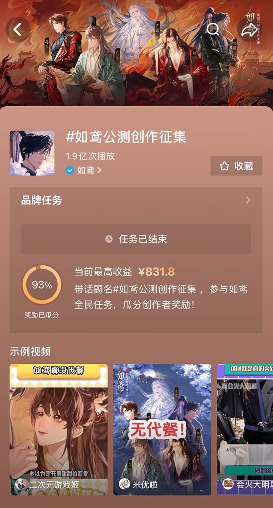 9月25日-10月15日开启公测创作征集活动,带上话题#如鸢公测创作征集即可参与活动,目前抖音该话题达1.9亿次播放,微博#如鸢话题阅读量达17亿,讨论量65万。