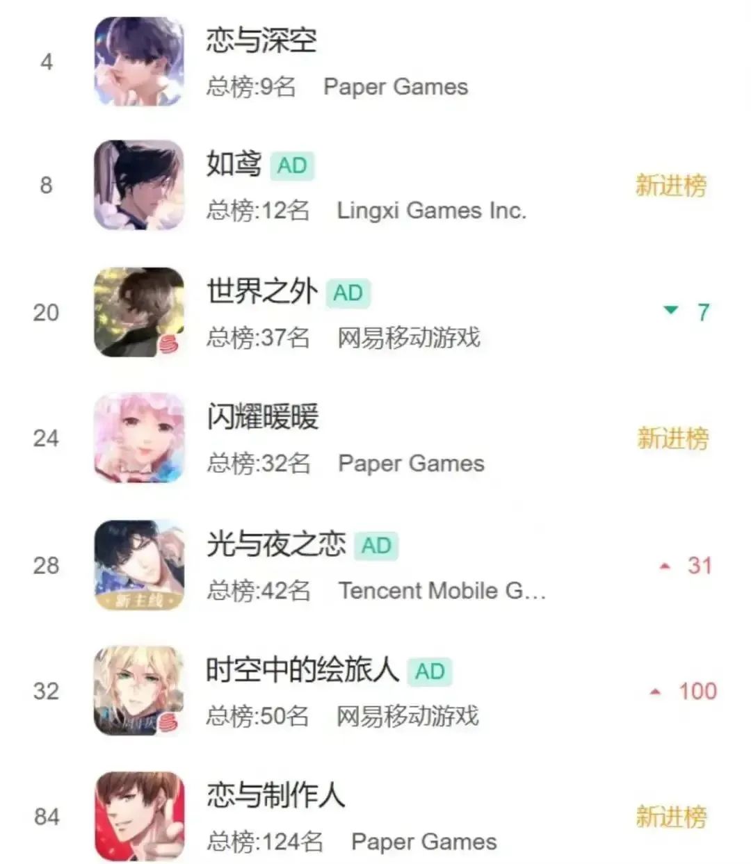 过去我们说四大国乙,目前算大洗牌了,2024新四强:《恋与深空》《世界之外》《如鸢》《光与夜之恋》。