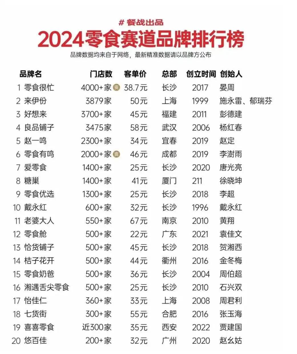 据统计,2024年各大知名零食品牌的客单价,零食很忙、好想来、赵一鸣、糖巢、爱零食等品牌均在三四十元左右,其中最低的零食舱的22元。
