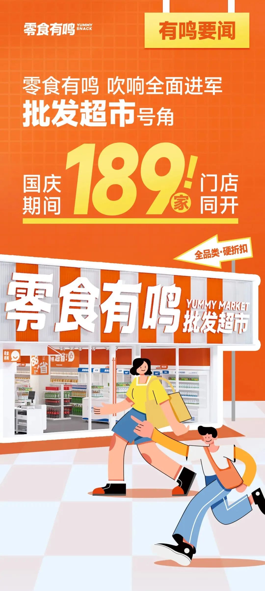 9月27日,零食有鸣官方发布公告称:将全面进军硬折扣全品类批发超市新业态,并在国庆期间,实现189家门店同时开业。随着公告一同打出的还有“一件也是批发价”“样样都是批发价”等宣传口号。