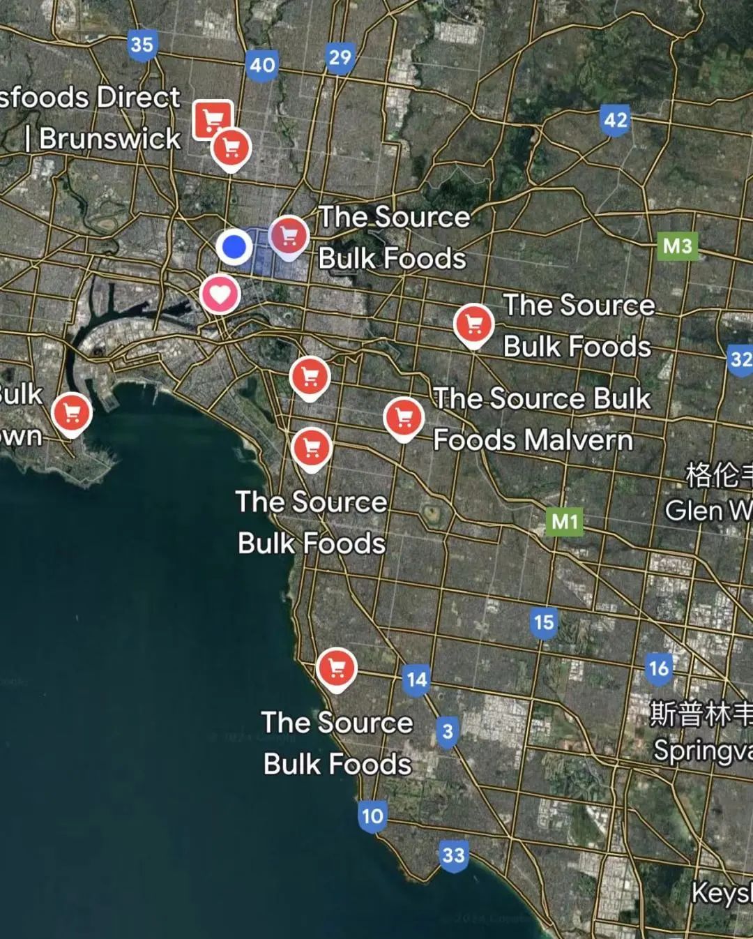 图中带有购物车的红点是墨尔本城市中干粮店的定位,图源@Google Maps截图
