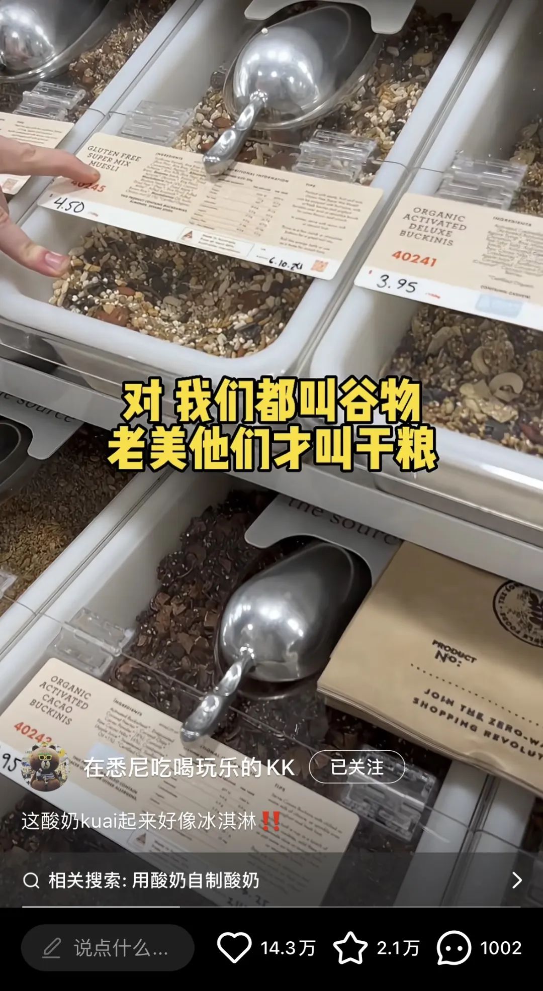 专门在澳洲拍摄吃喝探店视频的博主KK(原名“在悉尼吃喝玩乐的KK”),去年底在小红书发布了去干粮店为酸奶碗买配料的视频,谁知竟获得了14.3万的点赞并激起了1000多人次的讨论,大家的关注点都集中在了干粮店上。
