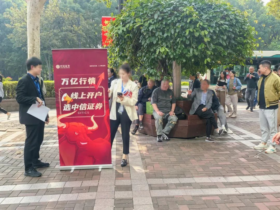 时代财经走访获悉,近两日,很多人来到此地就是为了目睹爷叔“爱在深秋”的风采。然而,据周边的股民反馈,在大盘经历回调的这两日,他并未出现。时代财经在当日也未发现其身影,不过却意外地遇到了中信证券在此地进行开户宣传。