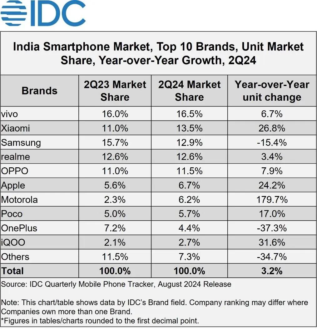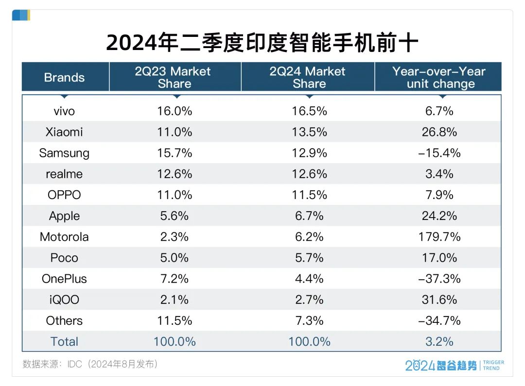 IDC数据显示,2024年二季度,中企强势归来,前5品牌中,中国品牌再次占领4席,分别为vivo、小米、realme(真我)、OPPO,唯一的例外三星,市场份额还在进一步缩减。