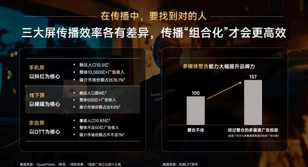 就生意层面来讲,凯度消费者调研曾有这样一个数据:100起消费中,有24起是在家庭场景中发生的。这一数量超过第二名近2倍。强曝光、一对多等优势,都是大屏进一步促进消费的先天优势。
