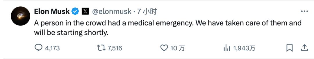 在今天原定的发布会正式开始之前(北京时间 10 月 11 日 10 点),全球各地的媒体记者、汽车行业人士以及科技爱好者们又在屏幕前苦等了一个小时,发布会才正式开始。马斯克在社交平台 X 上解释说,现场人群中有人突发疾病,他们为此耽误了一些时间。