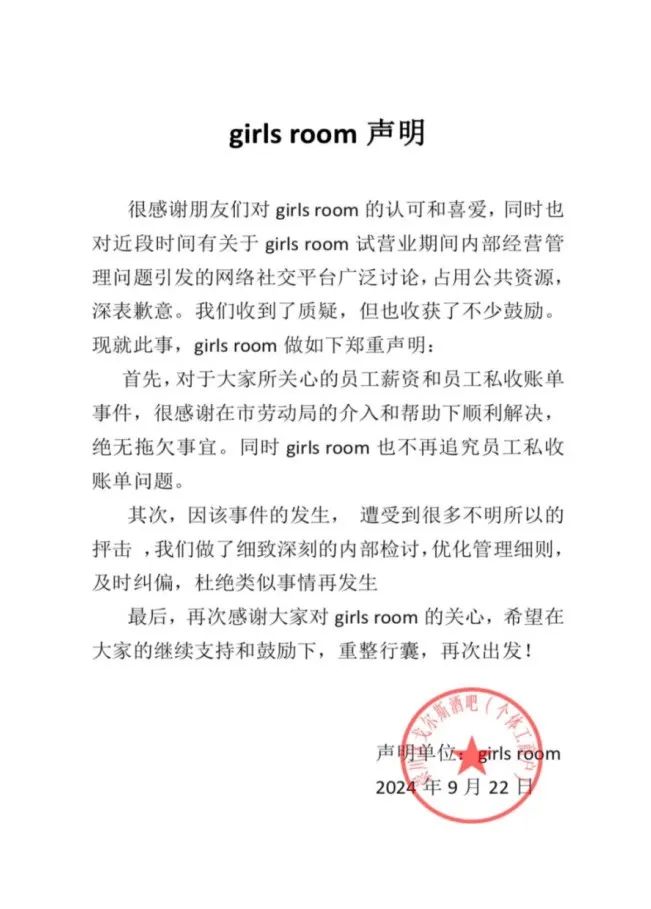 南通市全女酒吧girls room在纠纷和争议发生后,于社交平台发布声明。