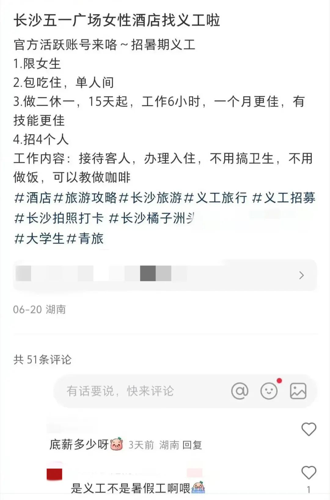 一家长沙的全女酒店招聘女性义工,招聘启事中未提及薪资报酬。(图/小红书)