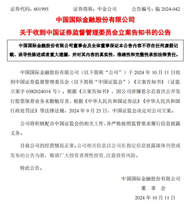 10月11日,中金公司发布公告,公司收到证监会立案告知书,因公司涉嫌思尔芯首次公开发行股票保荐业务未勤勉尽责,证监会决定对公司立案。