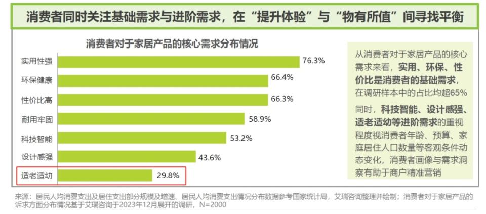 一是两亿老年人背后的万亿市场可观。随着人口结构变化,适老化家具需求爆发。民政部统计显示,截至2023年底,全国60周岁及以上老年人口29697万人,占总人口的21.1%。而中国老龄科学研究中心报告显示,2050年我国老年人口消费潜力或将达到40.69万亿元。