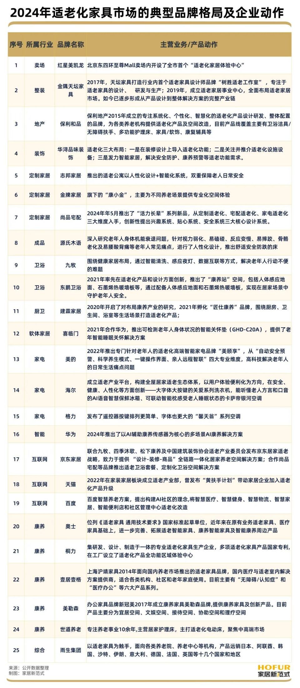 当前,越来越多的行业及品牌布局适老化家具。家居新范式梳理了包含金隅天坛家具、红星美凯龙、源氏木语、金牌家居、喜临门、海尔、京东家居、世道养老等在内的25家典型品牌,他们在适老化家具方面的动作代表了如今银发家居经济的主要市场格局: