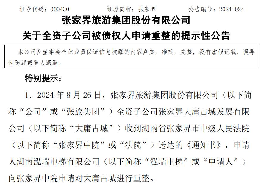 最新消息,张家界旅游集团股份有限公司(简称“张家界旅游”)发布公告称,湖南省张家界中级人民法院于9月11日裁定受理湖南泓瑞电梯有限公司对张家界旅游子公司大庸古城发展有限公司的重整申请。