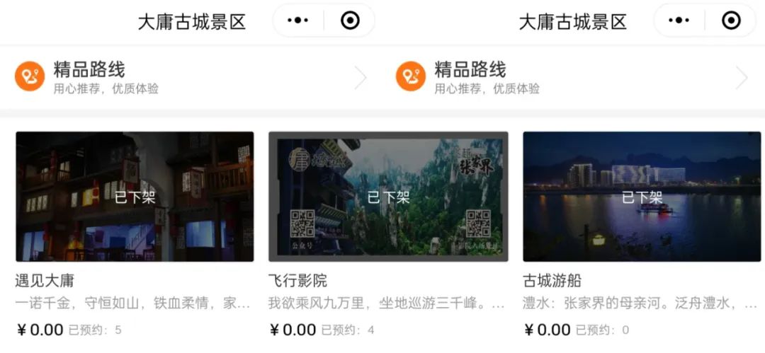 截至目前,从小程序张家界大庸古城中查看,《遇见大庸》、飞行影院与古城游船线上已经无法预订。