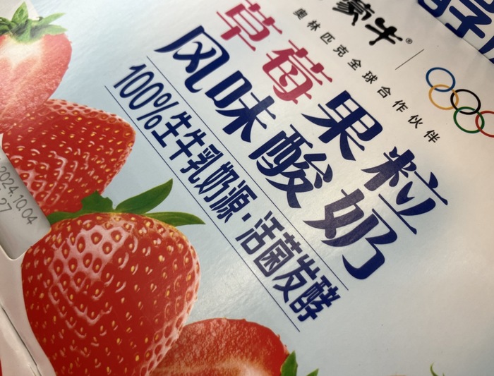 蒙牛在一款风味酸奶包装上标注“100%生牛乳乳源”(图片拍摄:界面新闻 赵晓娟)