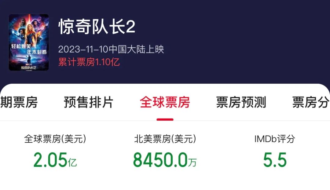 在去年美国演员工会结束罢工不久,《惊奇队长2》于11月中旬正式亮相,北美首周末仅拿到4611万美元,不仅比前作大幅跳水七成,更创下“漫威电影宇宙”的新低。最终《惊奇队长2》全球止步于2.05亿美元,在漫威影业主控的院线片中垫底。