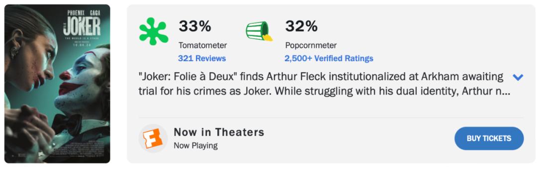从口碑来看,《小丑2》的烂番茄新鲜度低至33%,影评人表示华金·菲尼克斯“在一部充满舞蹈的续集中登场”,故事情节却波澜不惊,即便Lady Gaga为影片增添了一些活力。在爆米花指数上,《小丑2》也只有31%,观众称两位主演的歌声“提供了足够的火种,为这位犯罪王子维持了不温不火的热焰”。相比之下,前作在烂番茄上录得68%和89%,足见两片的风评差距之大。在映后环节,《小丑2》的CinemaScore评分仅为D,成为史上首部得到如此低分的漫改电影,甚至逊于弗朗西斯·福特·科波拉的《大都会》。