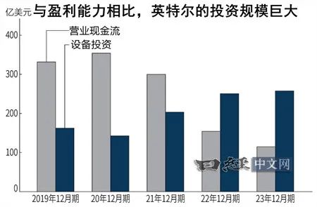 这需要巨大的投资。英特尔的设备投资额2023财年(截至2023年12月)达到约258亿美元,比3年前增加了8成。与此同时,营业现金流在同一时期下降了70%。与盈利能力相比,投资规模的巨大更加突出。