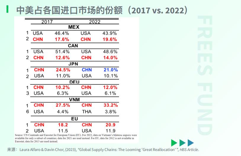 更值得一提的是, 中国企业正在增加对 越南、墨西哥 等国家的 直接投资 ,把部分 生产能力转移 到这些国家。这样将有助于中国 维持 在美国乃至全球市场的最终份额。