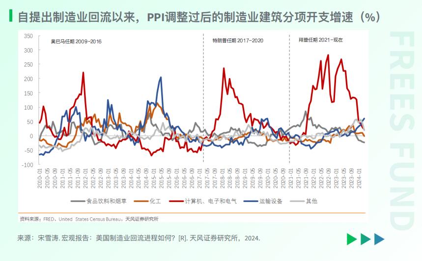 再看 投资 。与就业情况类似,每一次新的法案出台之后,都会带动一波投资的增长。不过,当这些法案的效应慢慢减弱之后,相关投资又会回落。以2022年8月9日通过的 《芯片与科学法案》 为例。法案通过后,催生了 计算机、电子和电气设备行业 的建筑分项投资的高速增长,增速一度超过 200% 。不过, 2024年 之后,相关投资开始 放缓 。
