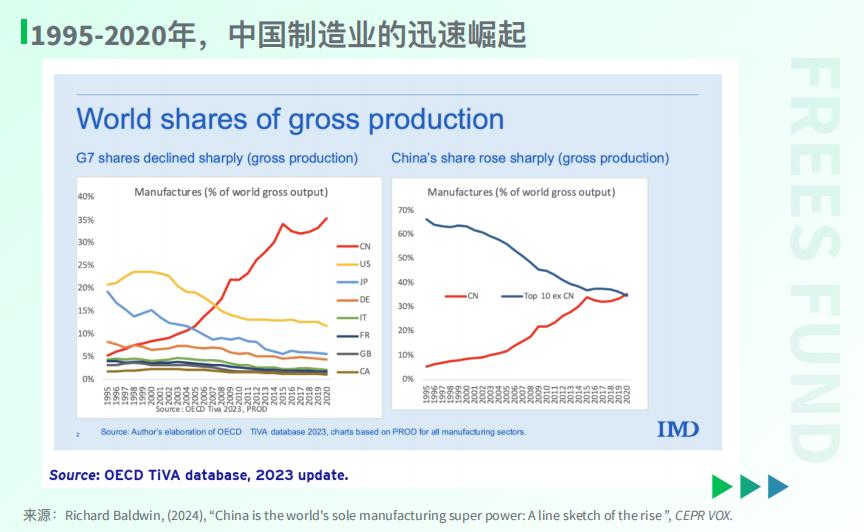 Richard Baldwin教授的研究追溯到了 1995年 。当时,中国与加拿大、英国、法国和意大利的制造实力相当。1998年,中国超越了德国,2005年中国超越了日本,2008年中国超越了美国。此后,中国制造业在全球的份额增加了 两倍 ,而美国的份额则下降了约3%。