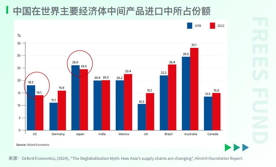 牛津经济研究所于 2024年1月发布的 一 份报告,统计了 中国占世界主要经济体中间产品进口的比例 。我们可以看到, 美国 从中国进口中间产品所占的比例,从 2018年 的 18.5% 下降到了 2022年 的 14.1% , 2023年上半年 ,这个比例进一步下降到了 11.4% 。除美国外, 日本 从中国进口所占的比例也呈小幅 下降 趋势。