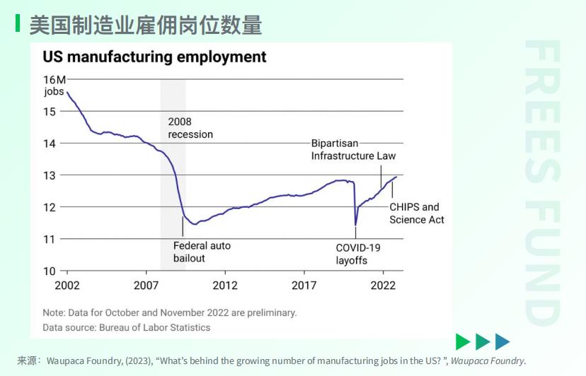 先看 就业 。美国劳工统计局的数据显示: 2002年 以来,美国制造业领域的岗位雇佣一直呈 下降 趋势; 2008年 之后,美国开始重视制造业的回归,制造业就业实现 小幅回升 ; 2022年 一系列新法案推出后,制造业就业也有 一定程度的回升 。但是 与2002年相比 ,美国在过去20多年里, 流失了二三百万个制造业岗位 。