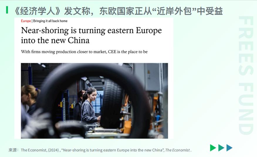 援引 《经济学人》 杂志于2024年9月21日发布的文章 《近岸外包“正在将东欧变成新的中国”》 ,美国和欧盟正限制从中国的进口,欧美公司纷纷开始转变策略, 将生产链转移至“近岸”和“友岸” 。近岸外包能够缩短供应链长度,提高物流效率,降低运输成本,减少地缘政治风险。