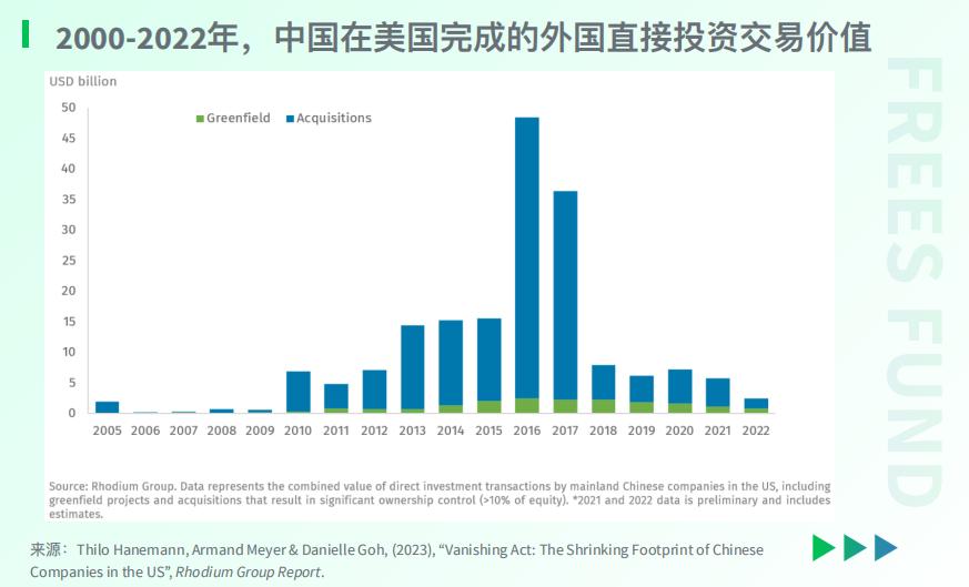 美国 曾经是中国对外投资的重要目的地之一,但现在美国已经 跌出 了中国对外投资的 前十 。根据美国经济研究公司荣鼎集团(Rhodium Group)2023年9月的报告,自 2017年 以来,中国对美国的 FDI持续放缓 ,具体而言,中国对美国的年度投资额从 2016年 的 460亿美元 锐减至 2022年 的 不足50亿美元 。