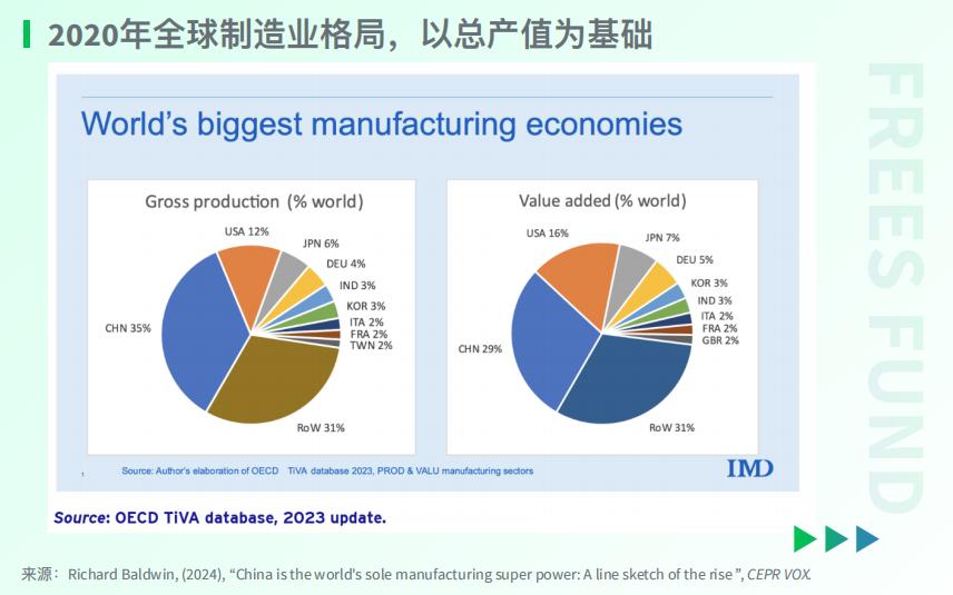 经济学家Richard Baldwin的一项研究显示,在 全球制造业总产值 中,中国占据绝对的 领先地位 (35%),份额大致为美国的三倍,日本的六倍,德国的九倍。在产值占全球3%以上的六个国家中,老牌工业国家有三个,即 美国、日本、德国 ,其余三个, 中国、印度、韩国 均为新兴工业化国家。