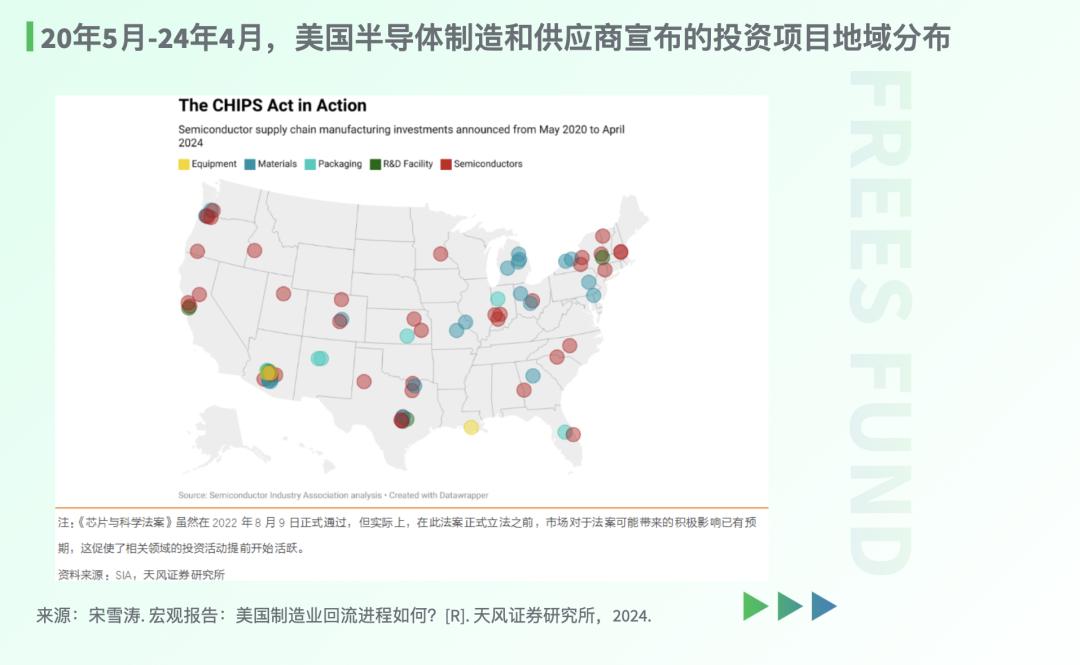 依据 美国半导体行业协会 (SIA)公布的数据,截至 2024年4月 ,全美各地宣布了超过 80个 半导体相关的新项目,吸引了共计 4470亿美元 的投资,投资计划主要用于新芯片制造厂和封装设施的建设,以及现有制造厂和封装设施的扩建。