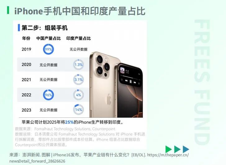 依据澎湃新闻的报道, 印度 在 2023 年 组装了 约 14% 的 iPhone。JP Morgan分析师,以及印度商务和工业部长 Piyush Goyal 都曾提到,苹果公司的目标是 2025年在印度生产 25% 的 iPhone 。