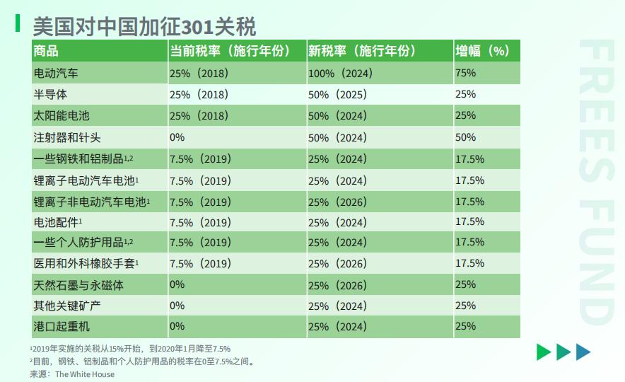 为了加强对国内产业的保护,减少对中国制造业的依赖,美国采取了 多重措施 。其中最主要的是, 对来自中国的商品征收高额关税 。尤其是对于电动车、半导体、电子产品和机械设备等产品,税率为 7.5%到25% 不等。