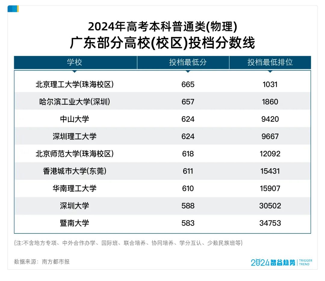最新的一个案例是,刚刚成立的深圳理工大学,2024年首次面向广东高考招生,最低投档线就高达624分,追平了广东省第一名校中山大学,超过了人称“华南小清华”的老牌名校、985高校华南理工大学14分之多。